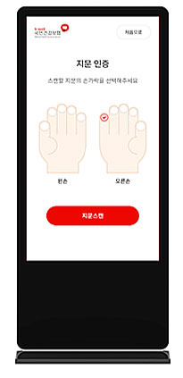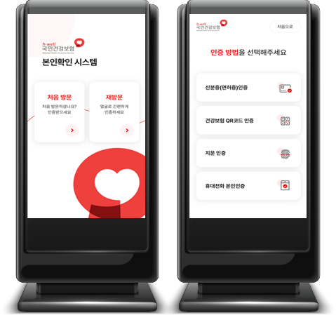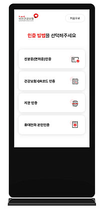 키오스크에는 본인인증 관련하여 신분증(면허증)인증 시스템, 휴대전화인증 시스템, 생체정보(지문) 시스템, 생체정보(얼굴) 시스템, 건강보험QR코드 인증 시스템으로 구성된 5가지 인증 서비스가 탑재되어 있습니다.
