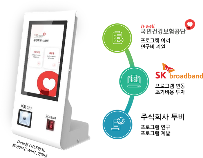 병의원 방문시 환자가 등록하면, 환자접수 시스템에 자동 접수됩니다. 본인확인을 위해서 누구나 보편적으로 사용할 수 있도록 휴대전화 및 신분증 본인 확인 서비스 탑재(SK Pass연동), 병의원에서 등록한 지문과 얼굴 사진을 통해 신분증과 일치된 본인 인증 서비스 탑재 (슈프리마, 메사코어 독점계약), 건강보험 APP에서 발급받은 QR코드로 인증으로 환자 본인이 간편하게 인증받고 접수할 수 있습니다.